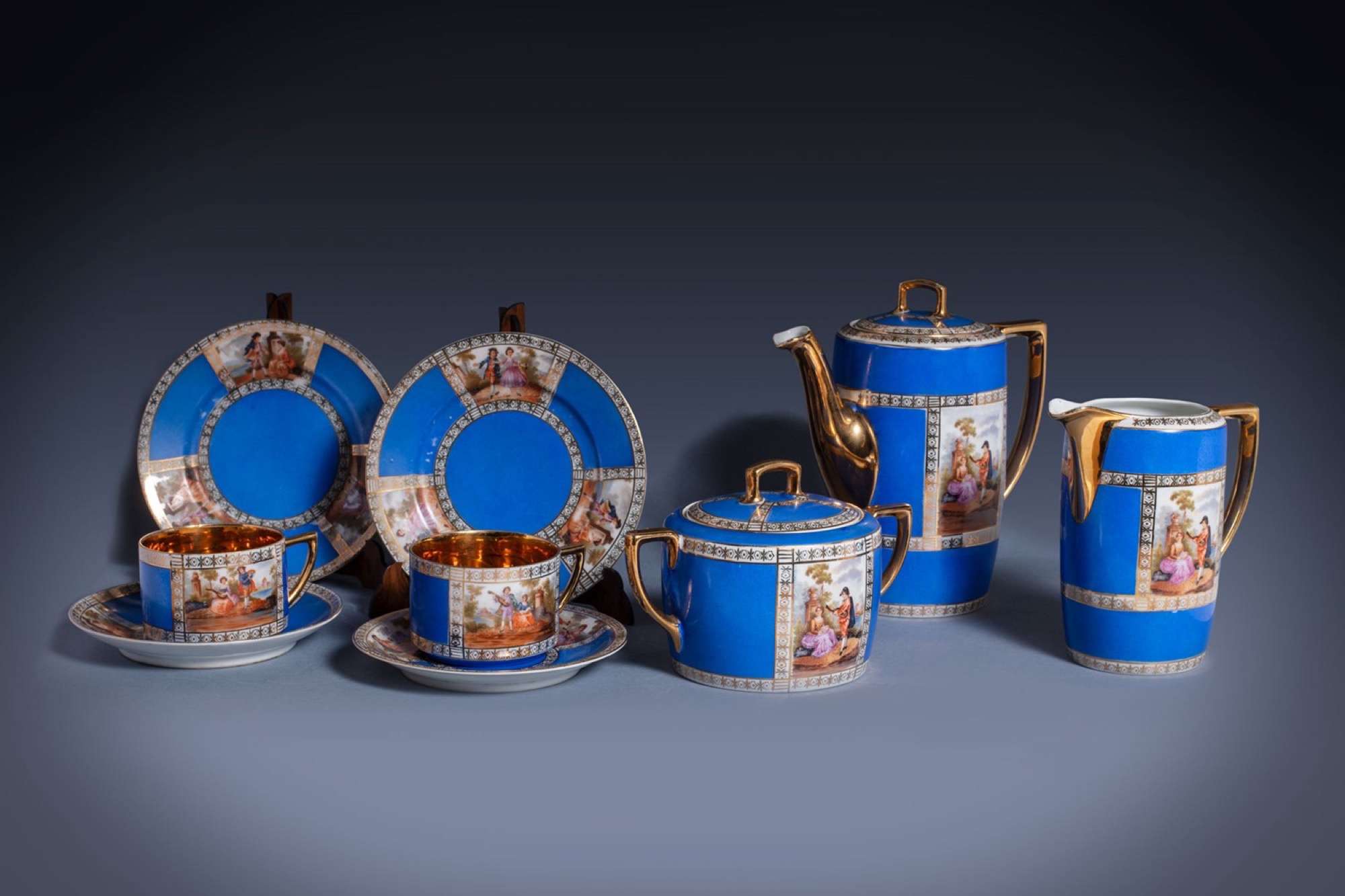 in porcellana blu e oro, con scene galantiin porcellana blu e oro, con scene galanti