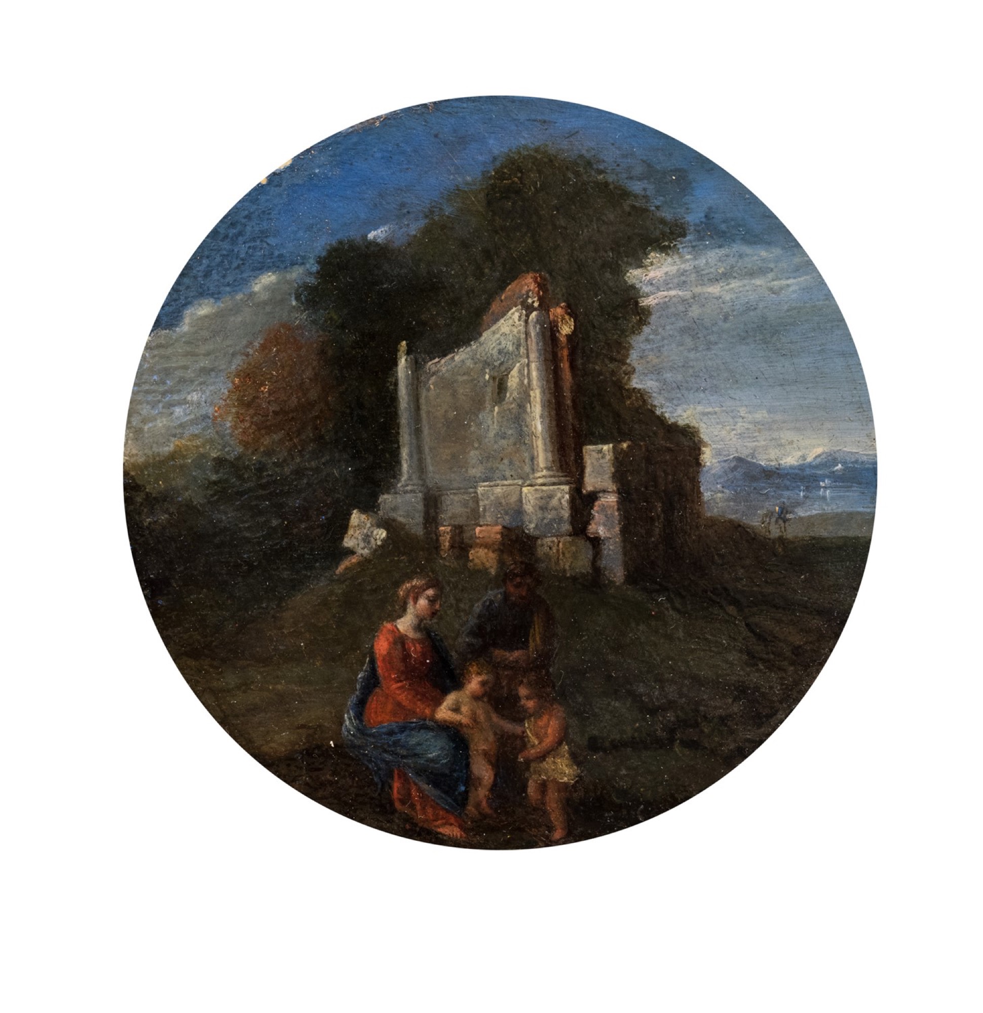 Scuola emiliana, secolo XVII - Sacra Famiglia con San Giovannino in un paesaggio con rovine classiche