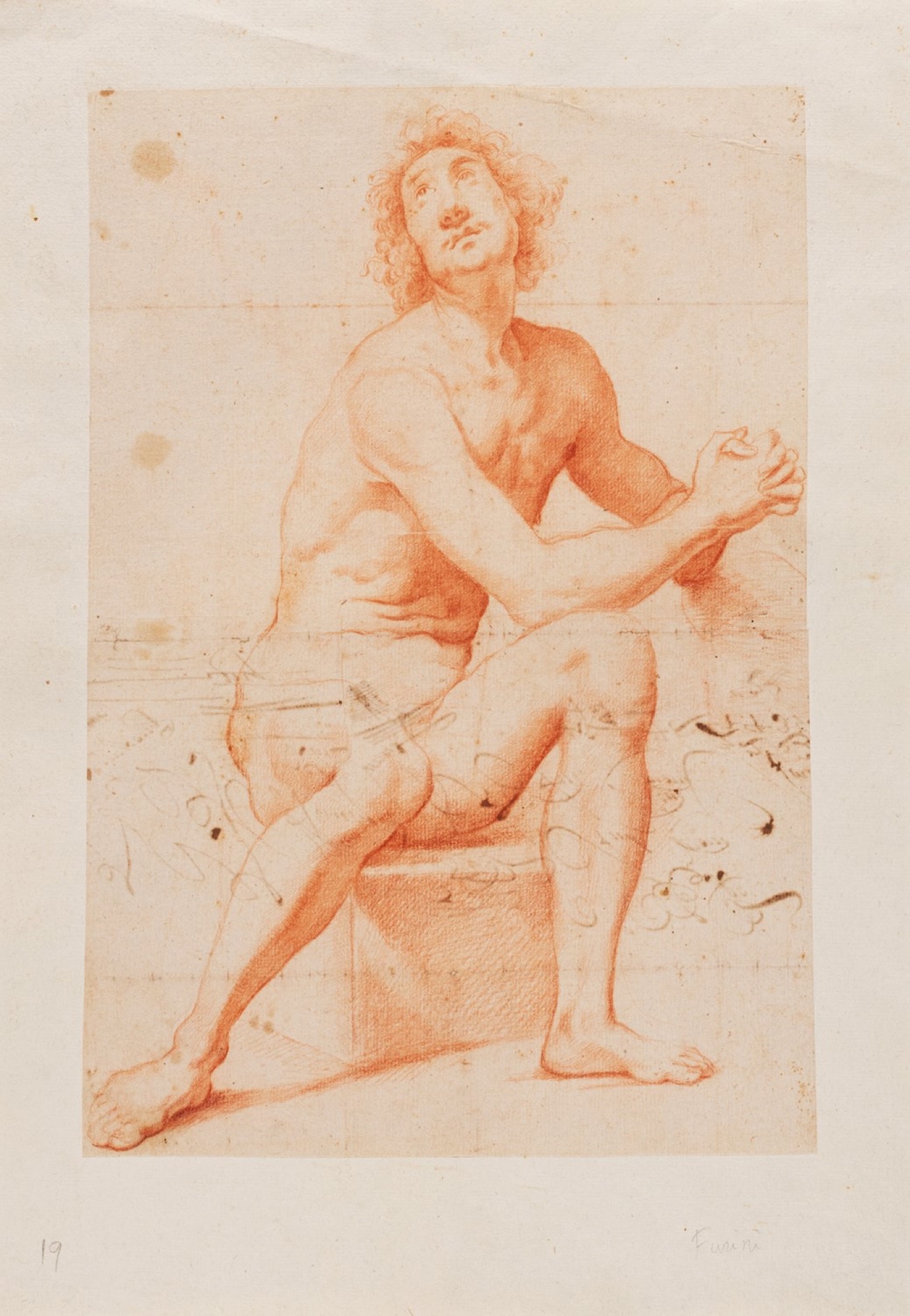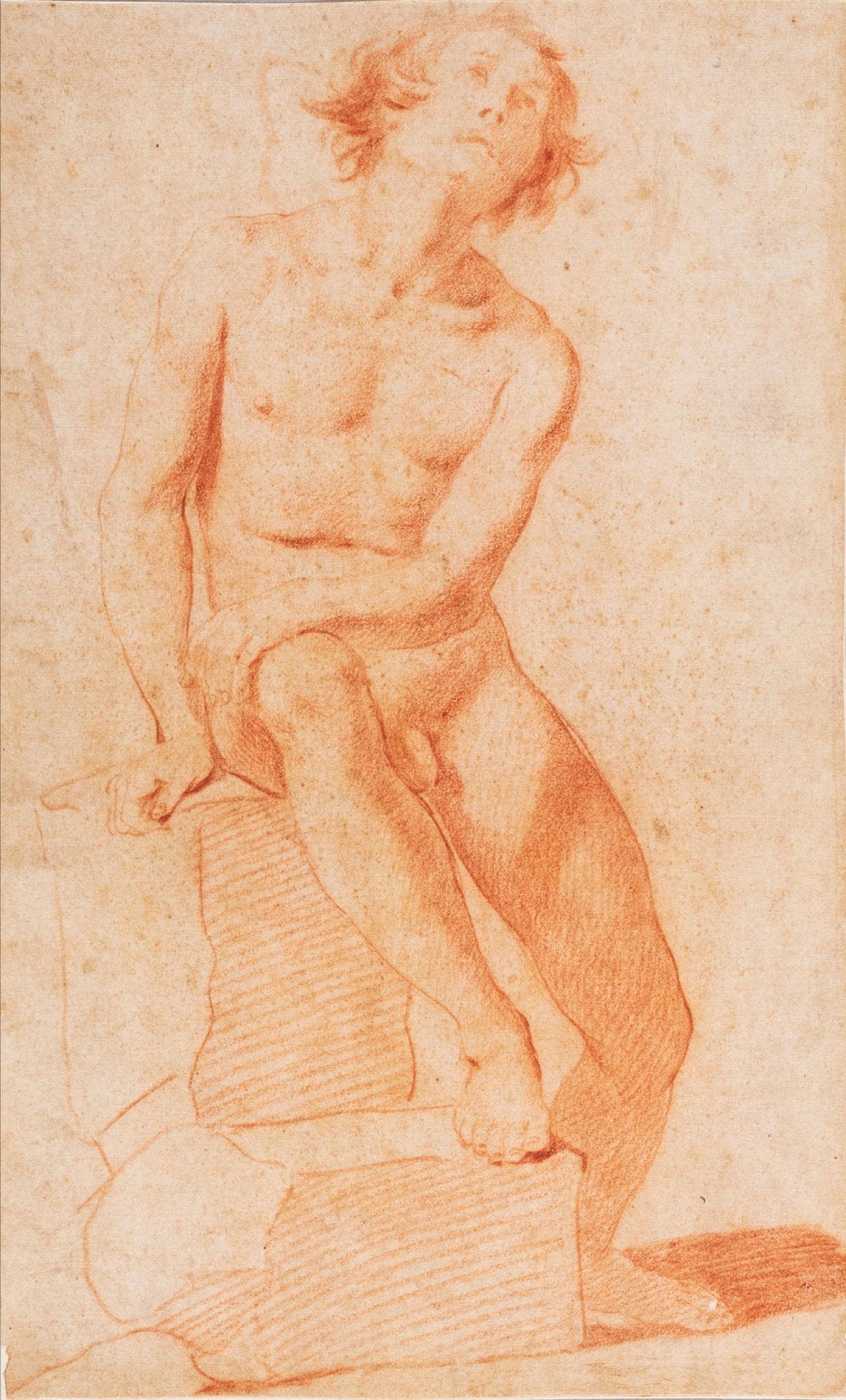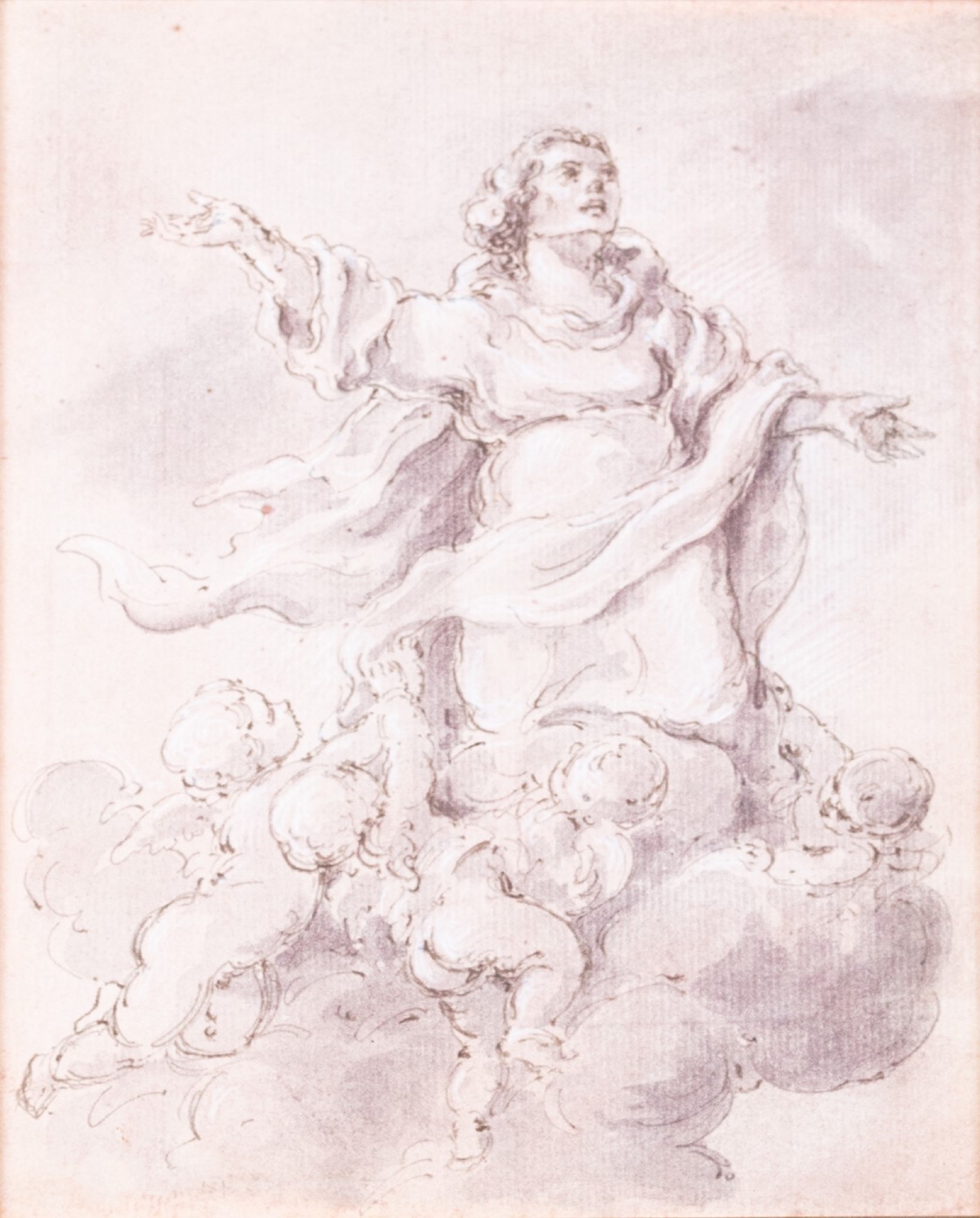 Disegno raffigurante Assunta con Angeli, e due studi di nudi virili a sanguigna