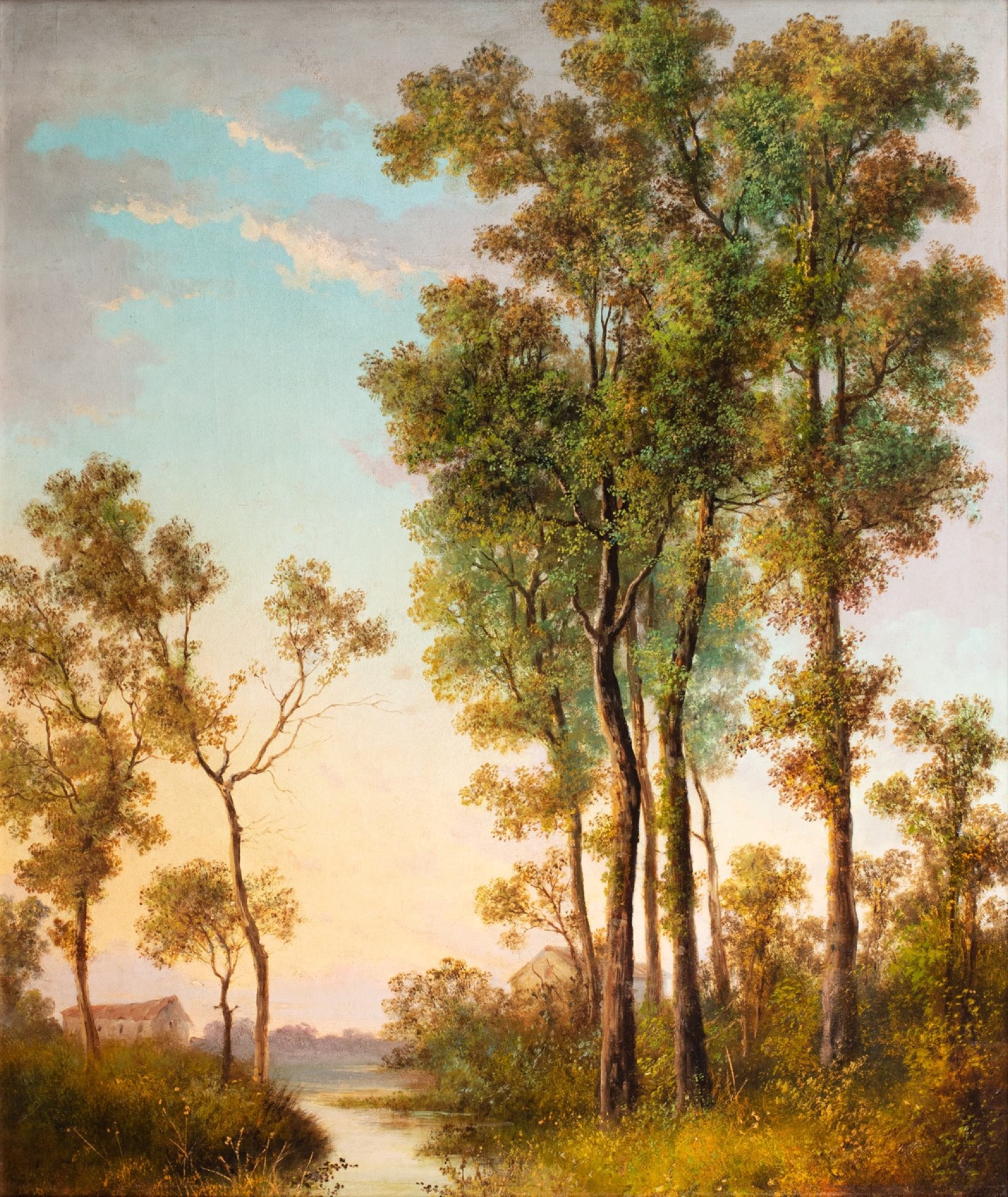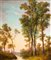 Scuola italiana, secolo XIX - Paesaggio lacustre con casolari in lontananza