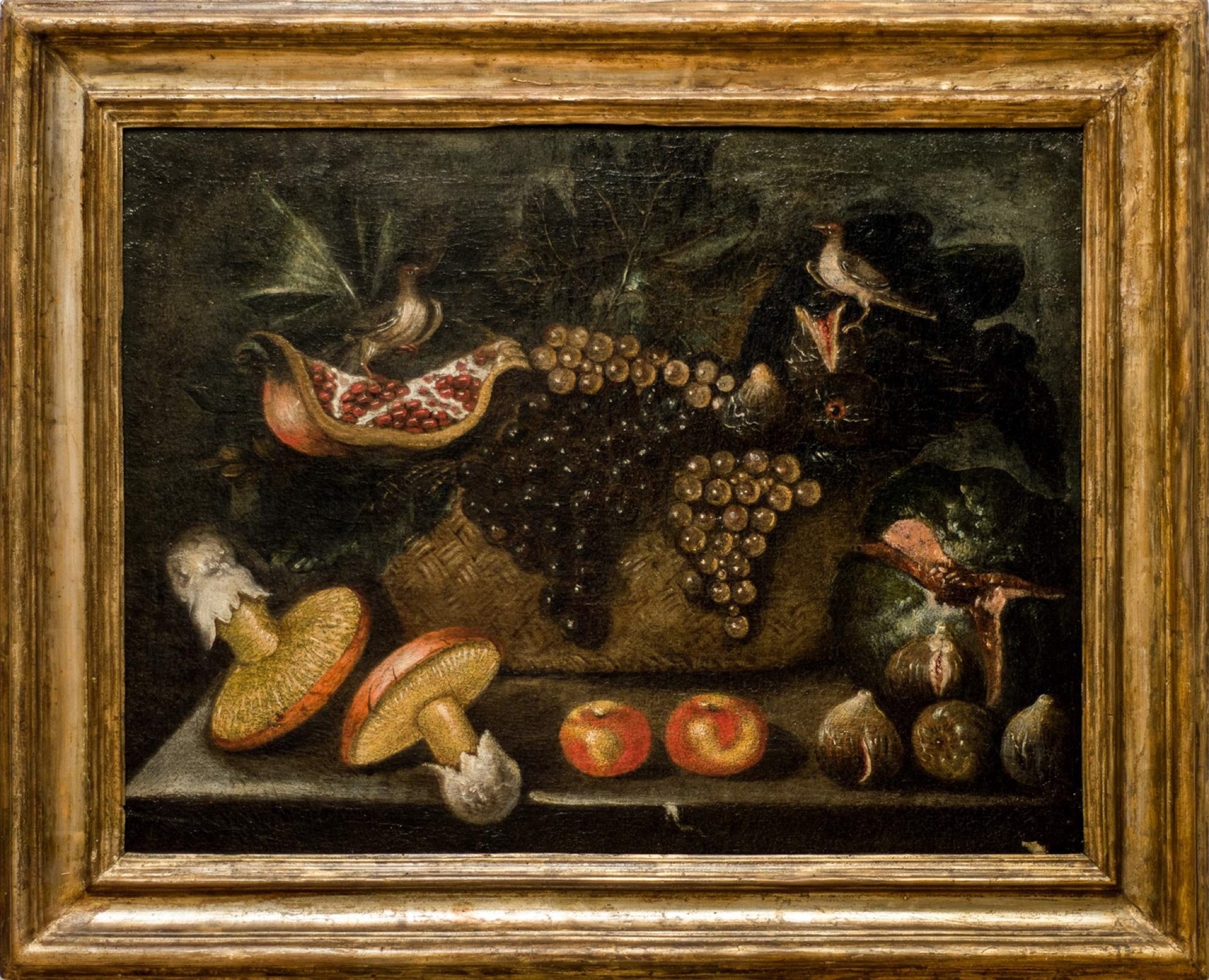 Scuola romana, inizi secolo XVII - Cesta di frutta con funghi e uccellini