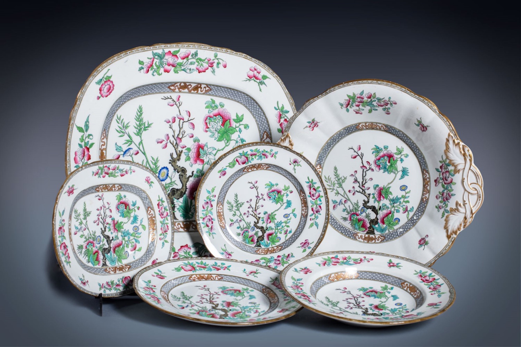 servizio composto da 24 piatti piani, 12 piatti fondi, 12 piatti mezzifondi, un piattino da portata ovale, un grande piatto da portata tondo e un altro grande piatto da portata ovale; decorati con motivi di ispirazione cinese con rami fioriti e peonieservizio composto da 24 piatti piani, 12 piatti fondi, 12 piatti mezzifondi, un piattino da portata ovale, un grande piatto da portata tondo e un altro grande piatto da portata ovale; decorati con motivi di ispirazione cinese con rami fioriti e peonie
