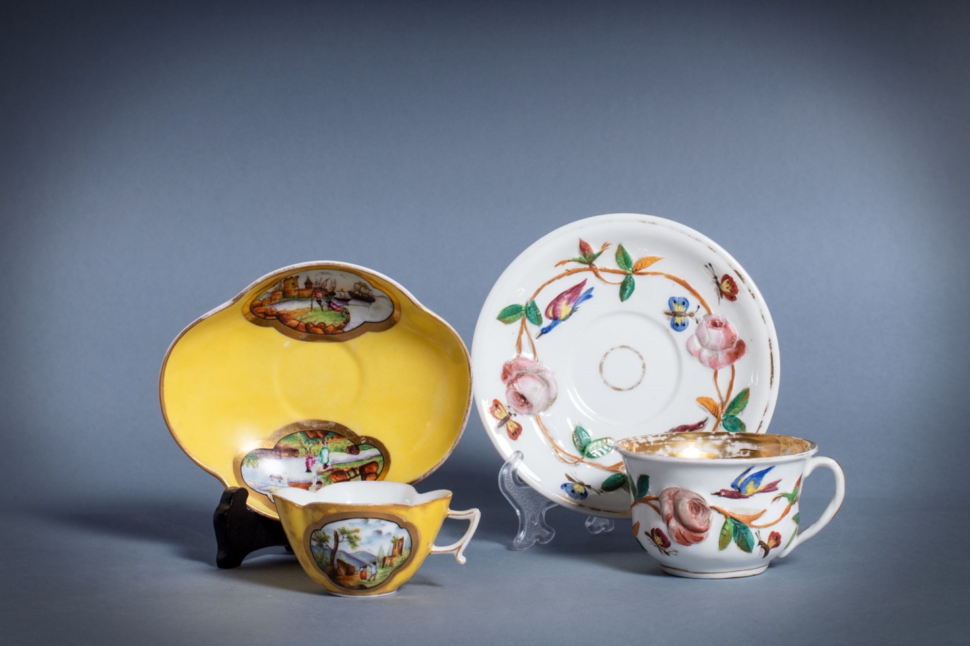 Due tazzine con piattino in porcellana, secolo XIX