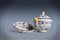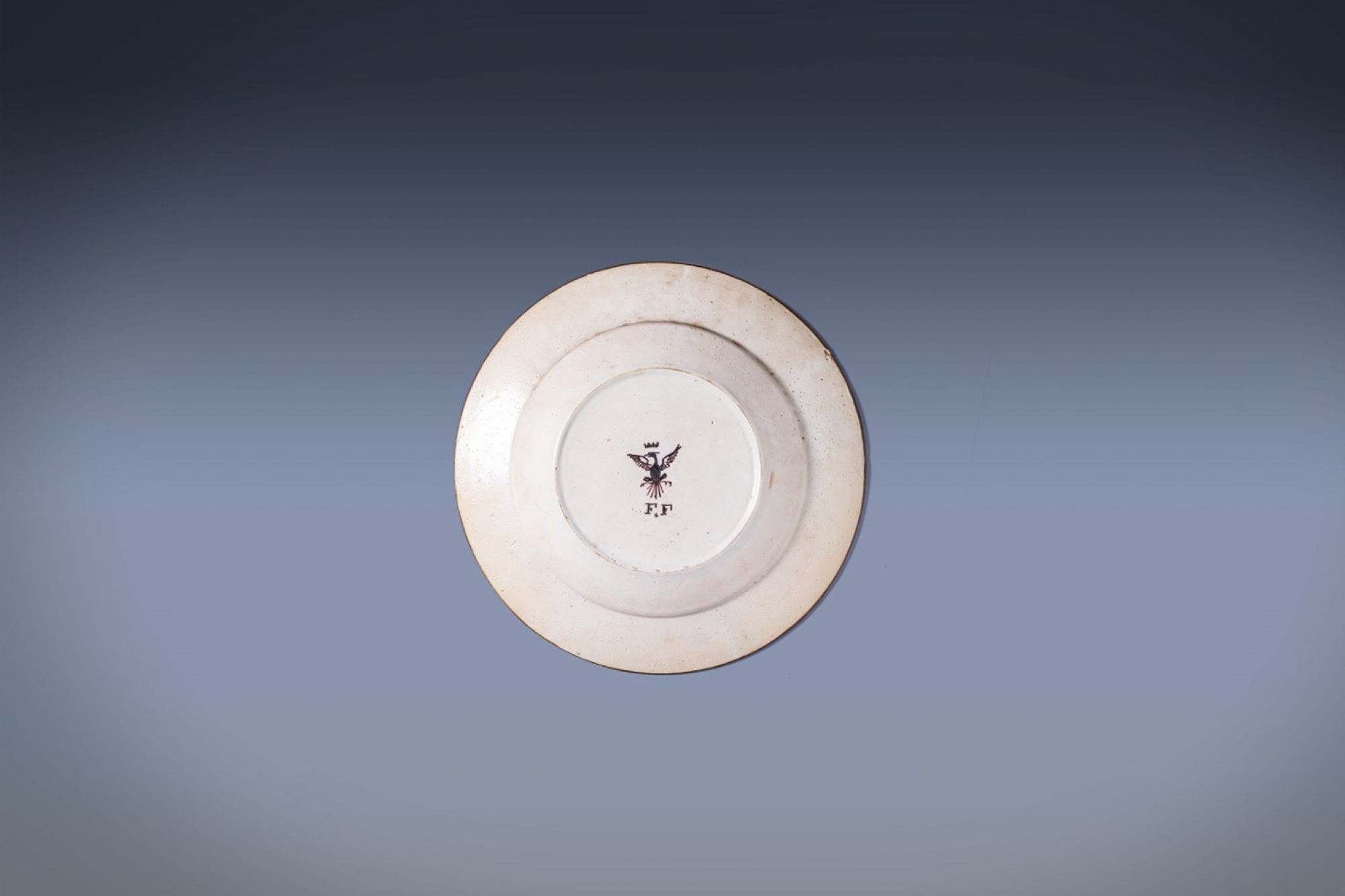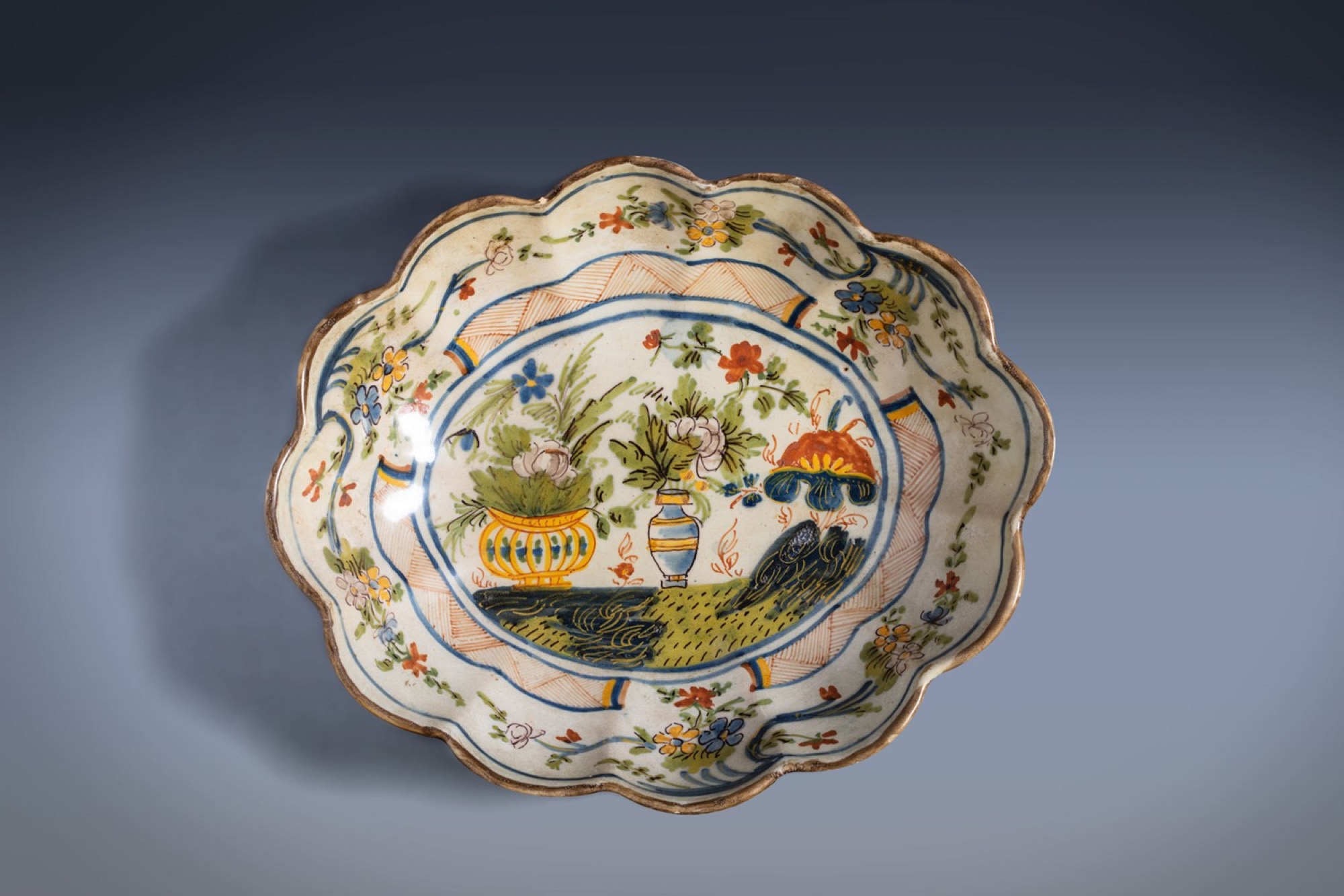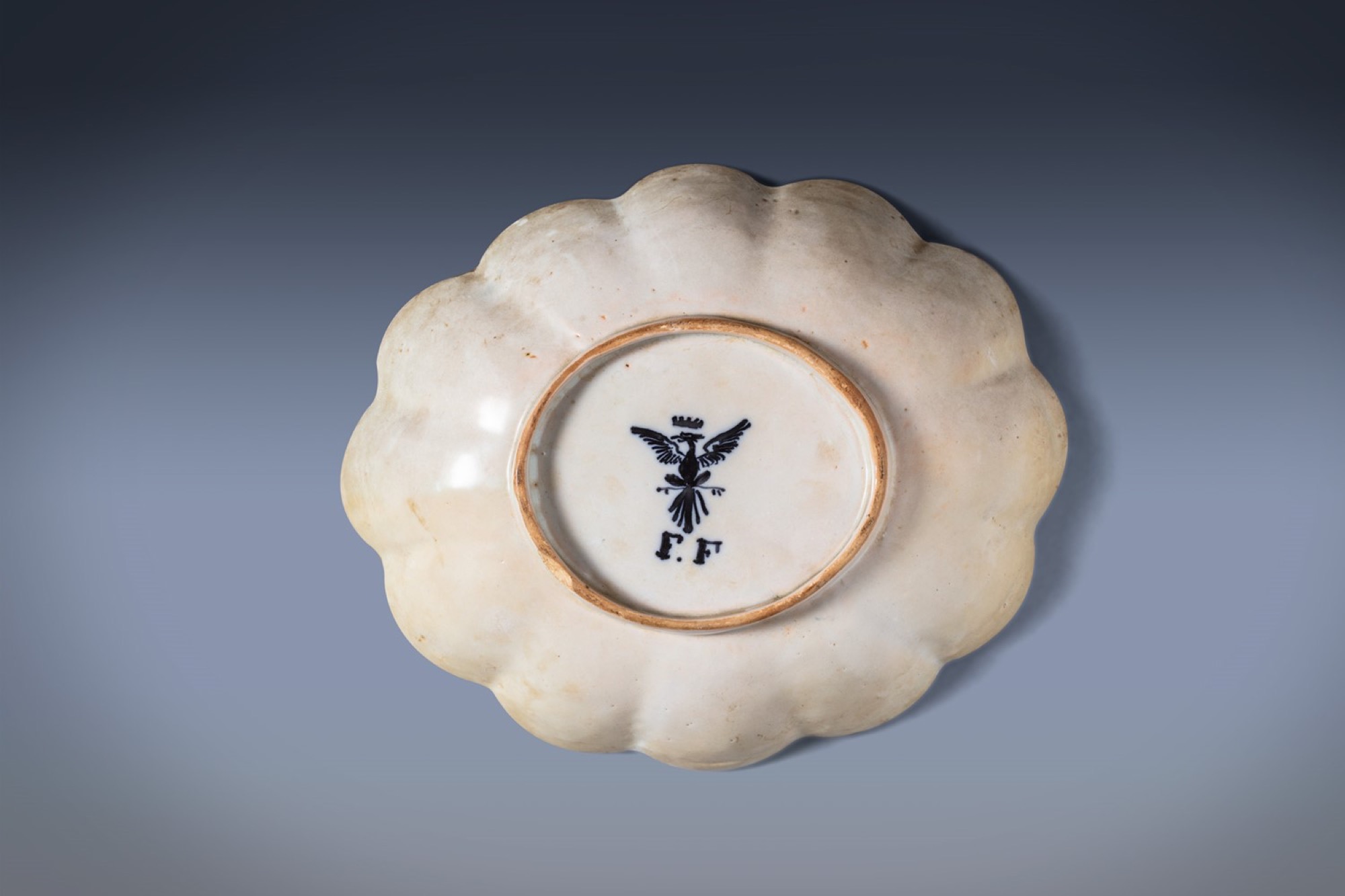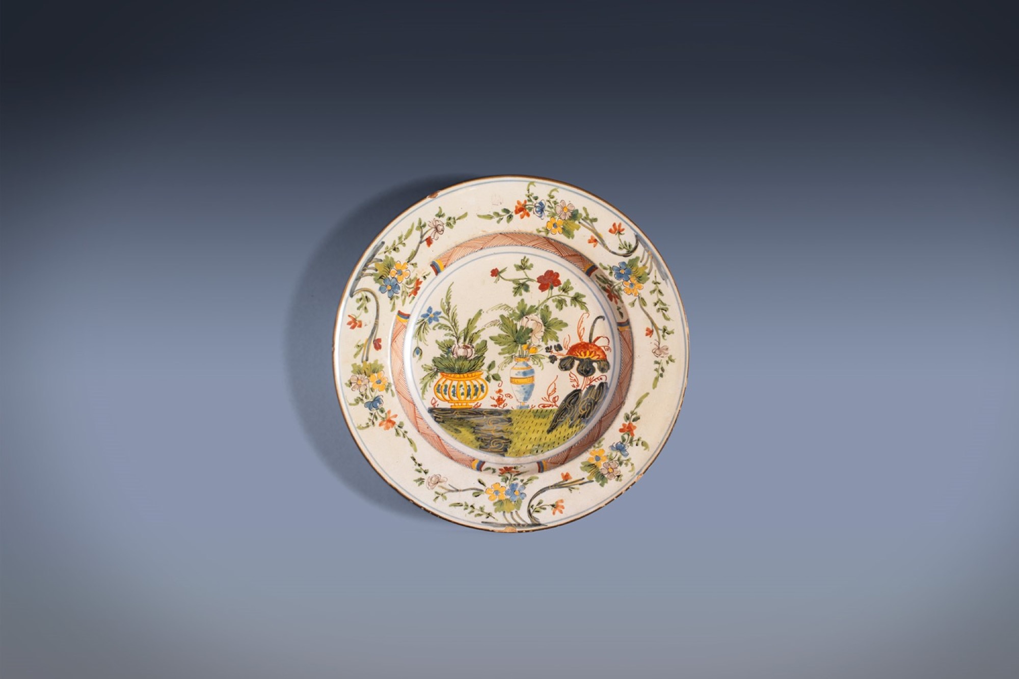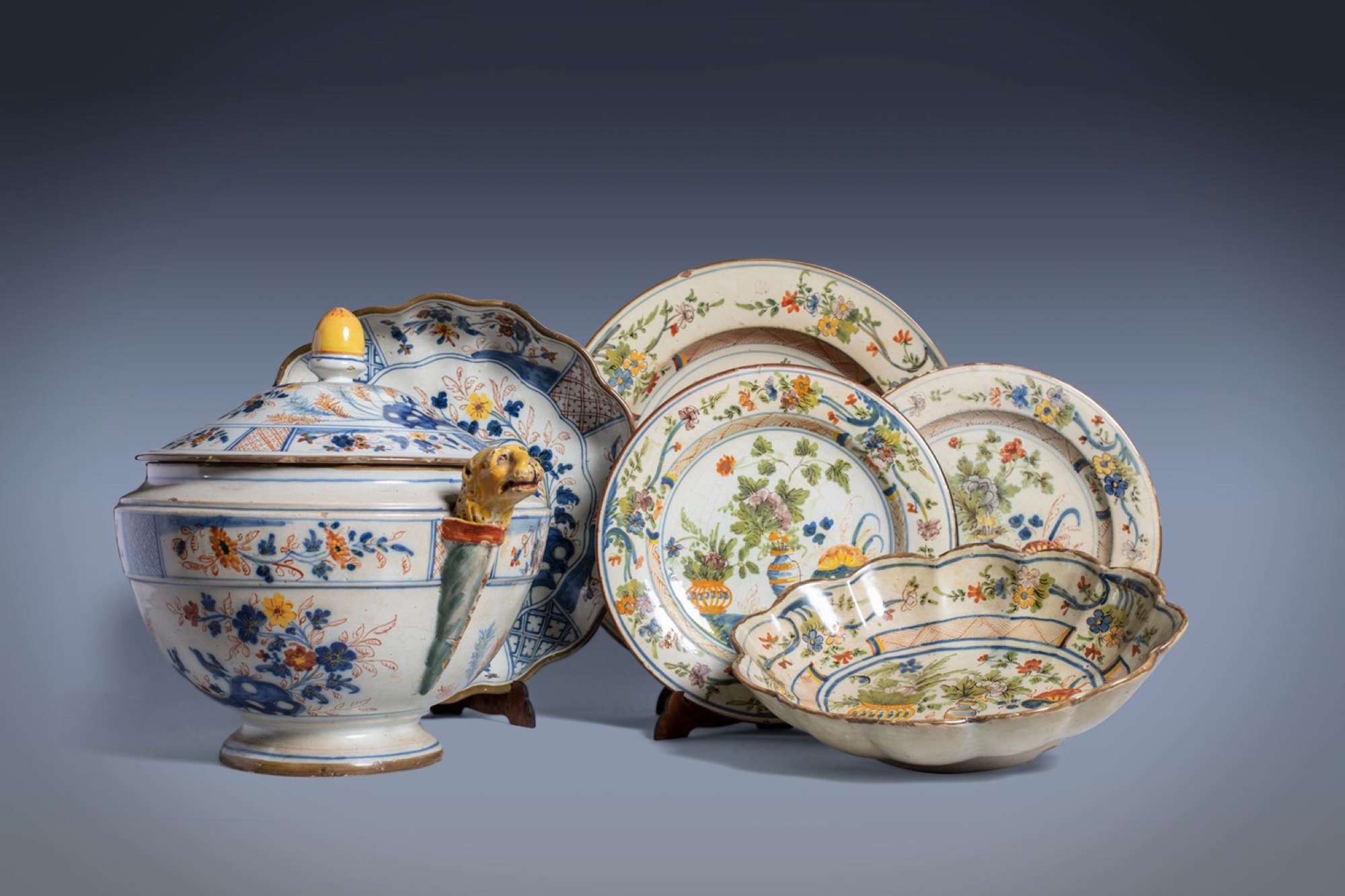 Servizio di Faenza, manifattura Ferniani, secolo XVIII, composto da: terrina cm 6,7 x 26,7 x 22 con marchio raffigurante aquila coronata e iscrizione FF sottostante (Ferniani Faenza); grande piatto da portata fondo altezza cm 4,5 e diametro 30,8, con marchio raffigurante aquila coronata e iscrizione FF sottostante (Ferniani Faenza); e quattro piatti piani altezza cm 2,5 e diametro cm 23,2. Il servizio presenta il medesimo decoro con cavetto circoscritto da una fascia geometrica centrato da vasi fioriti en plein air, tesa con racemi floreali tra doppio filetto in azzurro.