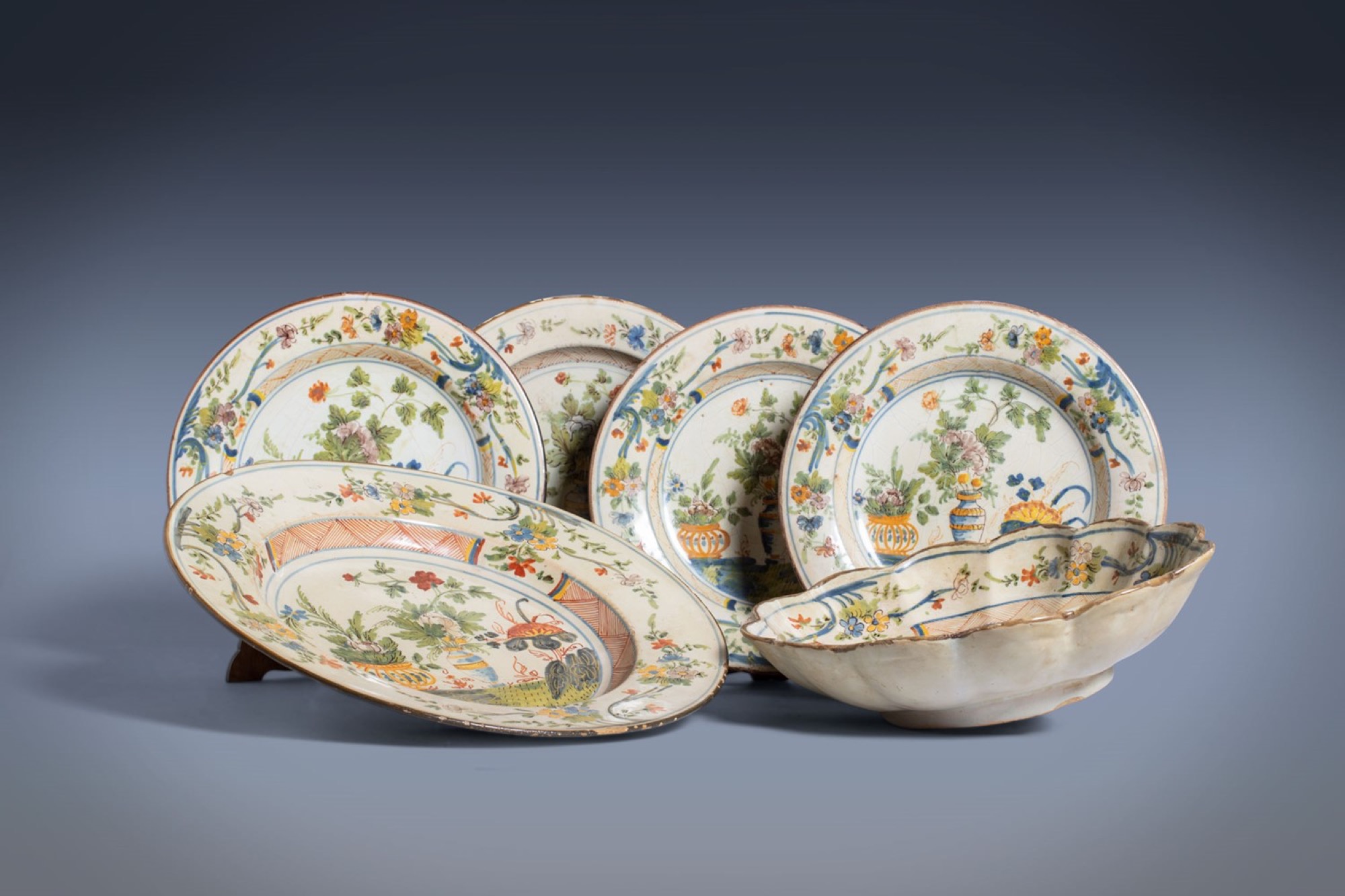 Gruppo di otto antiche maioliche, di cui sei di Faenza, manifattura Ferniani, secolo XVIII