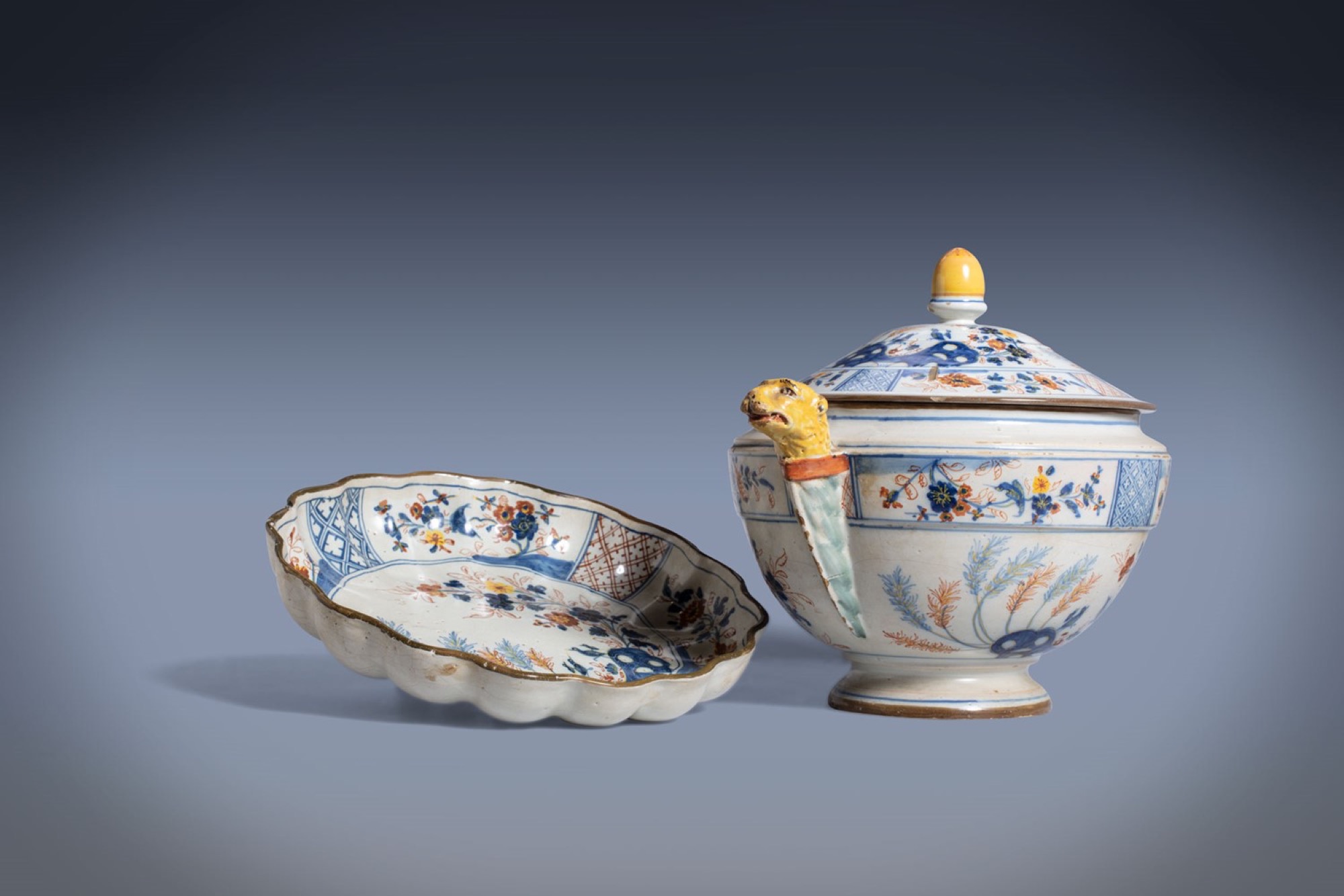 Di altra manifattura una zuppiera con manici a testa leonina e coperchio, cm 26 x 36,5 e un piatto polilobato altezza cm 5 e diametro cm 28