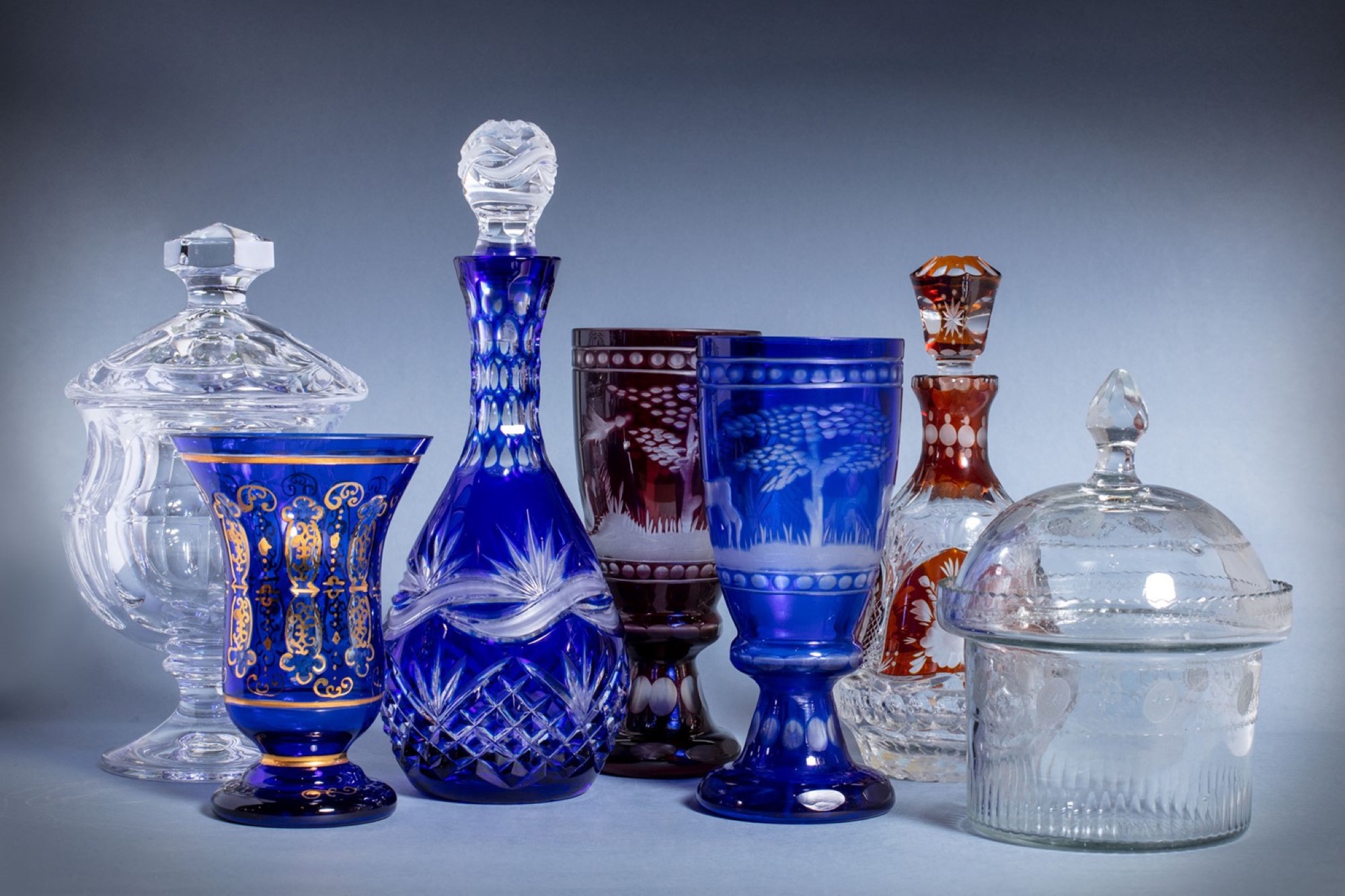 Lotto composto da sette oggetti in cristallo: tre bicchieri e due bottiglie con tappo in cristallo di Boemia, e due potiche, secolo XX