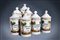 Sette albarelli da farmacia in porcellana, secolo XIX