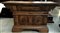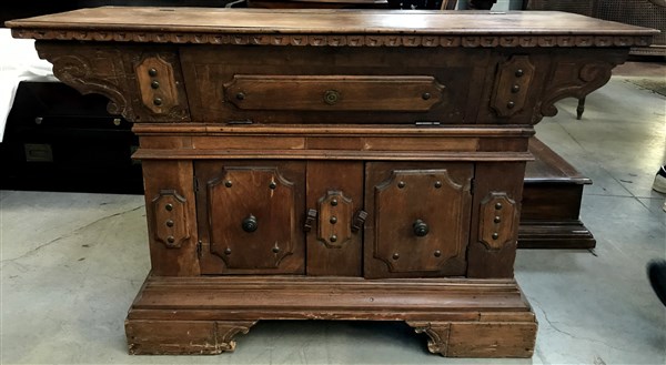 Madia a due ante in legno scolpito, applicazioni in metallo, piedi a mensola intagliati a volute (cm 101x66x39) (difetti e mancanze)