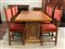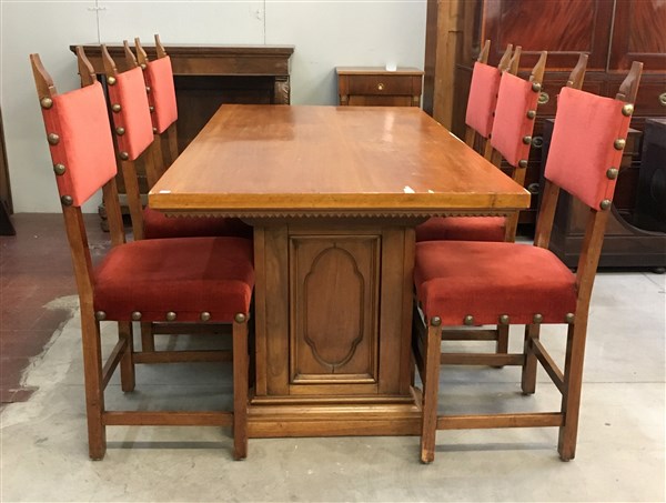 Tavolo da pranzo in legno con montanti scolpiti riuniti da traversa in bronzo. Unito a sei sedie in legno con seduta e schienale rivestiti in tessuto rosso (difetti e mancanze)