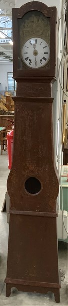 Orologio a torre del tipo "morbier". Movimento a due treni con suoneria su campanello. Quadrante in smalto bianco con numeri romani , mostra in ottone sbalzato (cm 48x 243,5x20 circa) (gravi difetti)