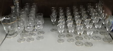 Lotto composto da cinquantadue bicchieri a calice di diverse dimensioni in cristallo con bordo dorato unito a una caraffa e due bottiglie di analoga fattura. (lievi difetti)