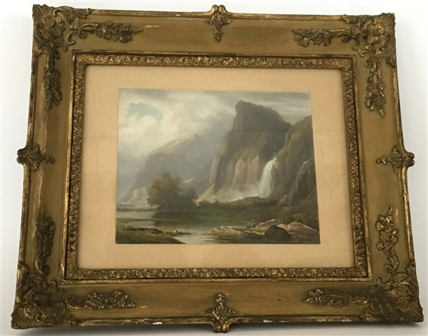 (Attribuito) "Paesaggio con cascata" olio su carta (cm 18x22,5) Firmato in basso a sinistra. In cornice