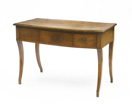 Antico tavolo scrittoio con tre cassetti nella fascia e quattro gambe a sciabola (cm 120x80x58) (difetti)