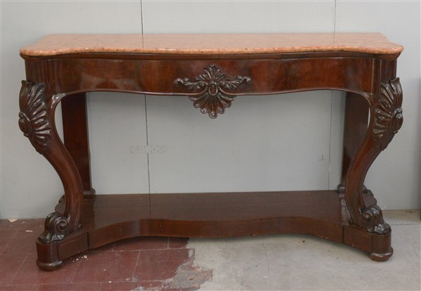 Consolle lastronata con fascia e gambe mosse intagliate a motivi stilizzati. Gambe poggianti su ripiano sagomato. Secolo XIX.(cm 156x95x50) (difetti e piano in marmo non pertinente)