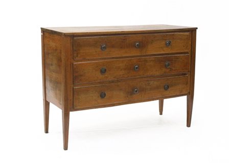 Comò in noce a tre cassetti interamente decorato con filettature. Quattro gambe rastremate, secolo XVIII (cm 142x100,5x55) (difetti e restauri)