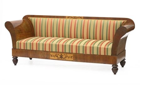 Divano a barca "Carlo X" in mogano decorato con intarsio vegetale sulla fascia e sullo schienale. Quattro piedi torniti a cipolla, secolo XIX (cm 210x83x58,5) (difetti)