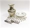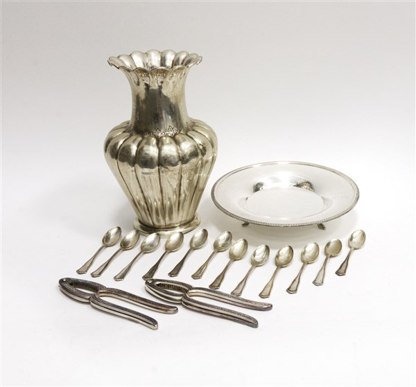 Lotto composto da un vaso a corpo costolato, un'alzatina con bordo cesellato a palmette, dodici cucchiaini da caffè in argento (g 900 ca.) unito a due schiaccianoci in metallo argentato e smaltato