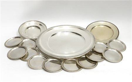 Lotto composto da tre piatti tondi e dodici sottobicchieri in argento con bordi