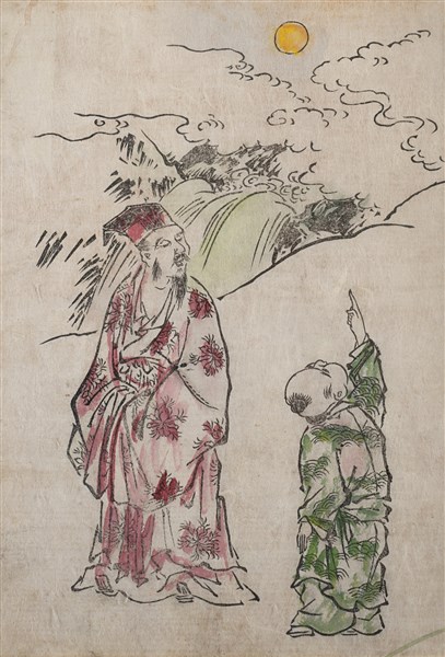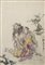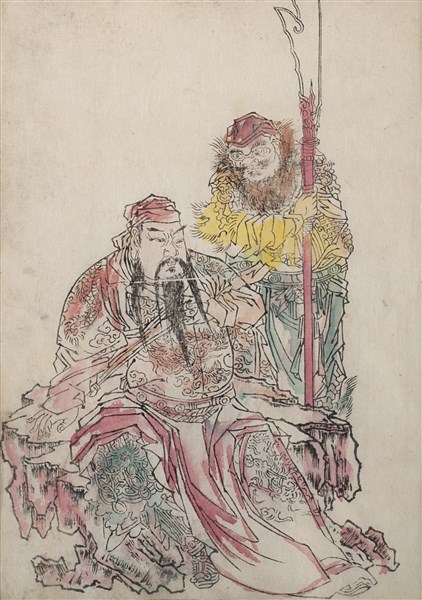 A group of twelve coloured prints depicting figures and calligraphy (defects)