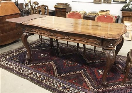 Tavolo da centro in noce con piano di forma sagomata, fascia decorata a cartelle profilate, gambe di forma mossa terminanti a ricciolo. Costruito con elementi antichi (173,5x80x94) (difetti e restauri)