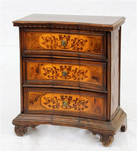 Comodino in stile secentesco a tre cassetti intarsiati a motivi floreali stiliz
