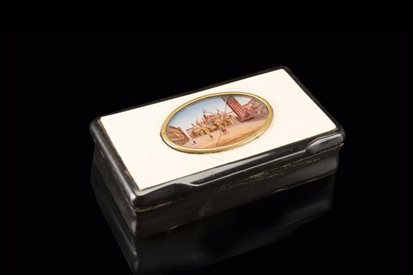 Tabacchiera di forma rettangolare in tartaruga con coperchio decorato da uno scorcio di piazza San Marco a Venezia. Secolo XIX (cm 9x2,5x5) (difetti)