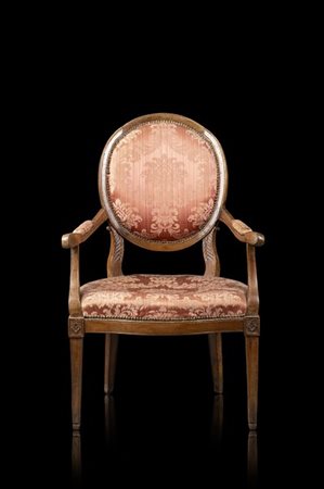 Poltrona con schienale di forma ovale e montanti mossi, gambe rastremate. Secolo XVIII (difetti)