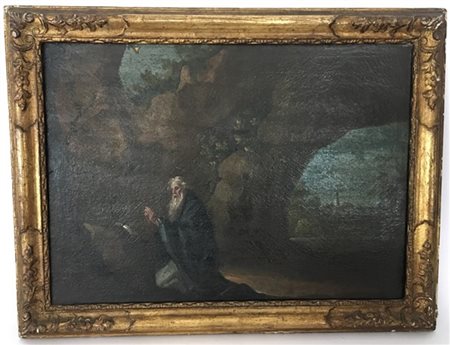 Scuola secolo XVIII "Santo eremita" olio su tela (cm 48,5x66). In cornice (difetti e restauri)