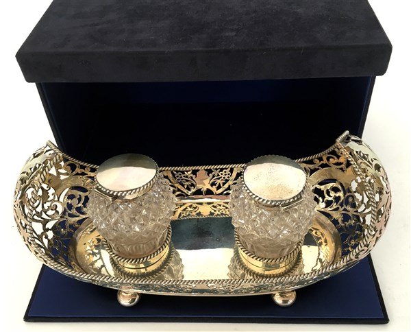 Calamaio a "barca" con bordi traforati a volute e motivi stilizzati. Vaschetta in vetro. Punzoni di Chester 1910 (g 429) In custodia. Provenienza: Dabbene, Milano
