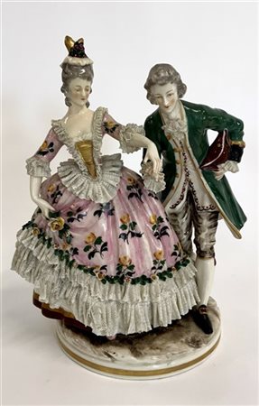 Gruppo in porcellana policroma raffigurante scena galante (h. cm 25) (difetti)