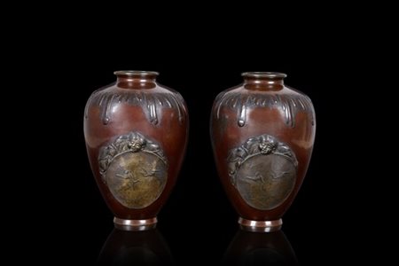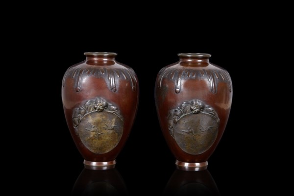 Coppia di vasi in bronzo decorati in rilievo con fanciullo (lievi difetti) Giap