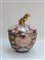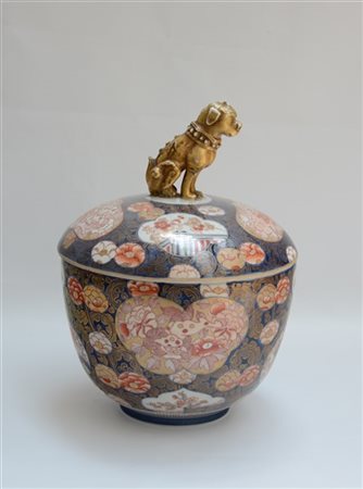 Potiche in porcellana a smalti Imari con pres a guisa di leone Buddista. Giappo