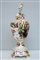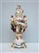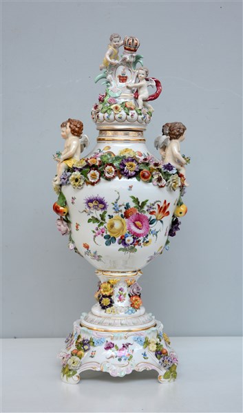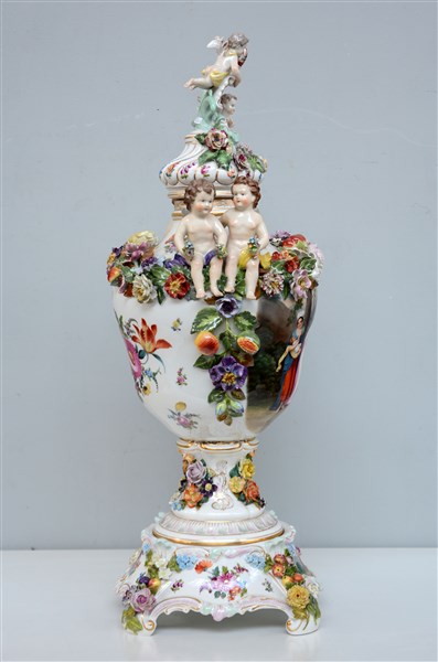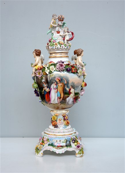 Manifattura tedesca, inizio secolo XX. Vaso con coperchio in porcellana policroma e parzialmente dorata decorata a scena classica sul fronte e a motivi di frutti e fiori in rilievo. Anse a putti a tutto tondo. Coperchio sormontato da stemma coronato e putti. Base a quattro piedini a ricciolo (h. cm 90) (mancanze)