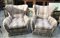 Coppia di poltrone con schienale di forma avvolgente, rivestite in tessuto deco
