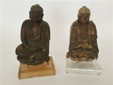 Arte cinese. Coppia di antiche sculture in terracotta smaltata raffiguranti Buddha, basi in plexiglass (h. cm 26) (gravi difetti)
