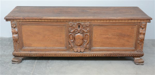 Cassapanca con fronte scolpito al centro da stemma nobiliare entro volute e montanti ad erme, piedi sagomati, sec. XVII (cm 160x57x52)(difetti e restauri).