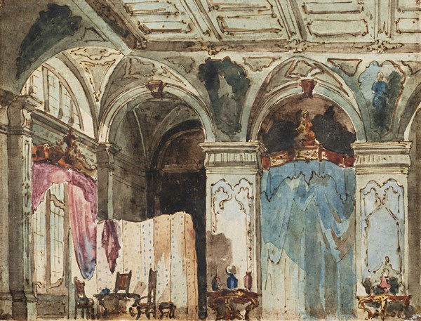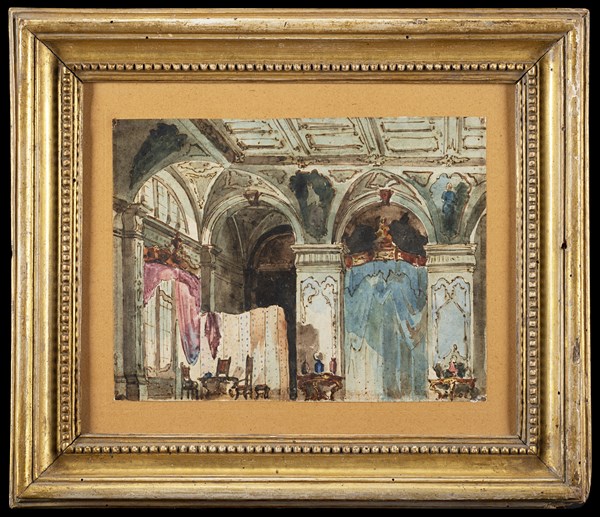 Scuola del secolo XIX Scenografia Penna, inchiostro bruno e acquerelli su cart