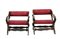 Coppia di poltroncine basse in legno intagliato , seduta e schienale ricoperti in tessuto jacquard rosso (difetti)