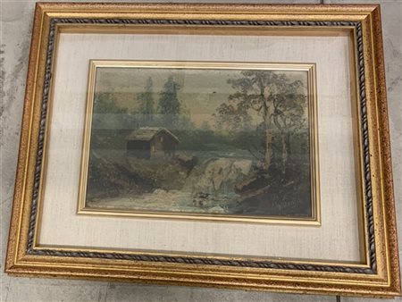 "Baita nel bosco con cascata" olio su tela (cm 25x35) Firmato in basso a destra. In cornice