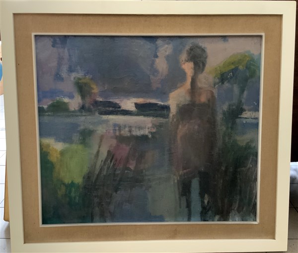"Sere sul Po" 1964, olio su tela (cm 60x70) Al retro: cartiglio mostra antologica di Giuseppe Motti, Milano 1965. In cornice (difetti)