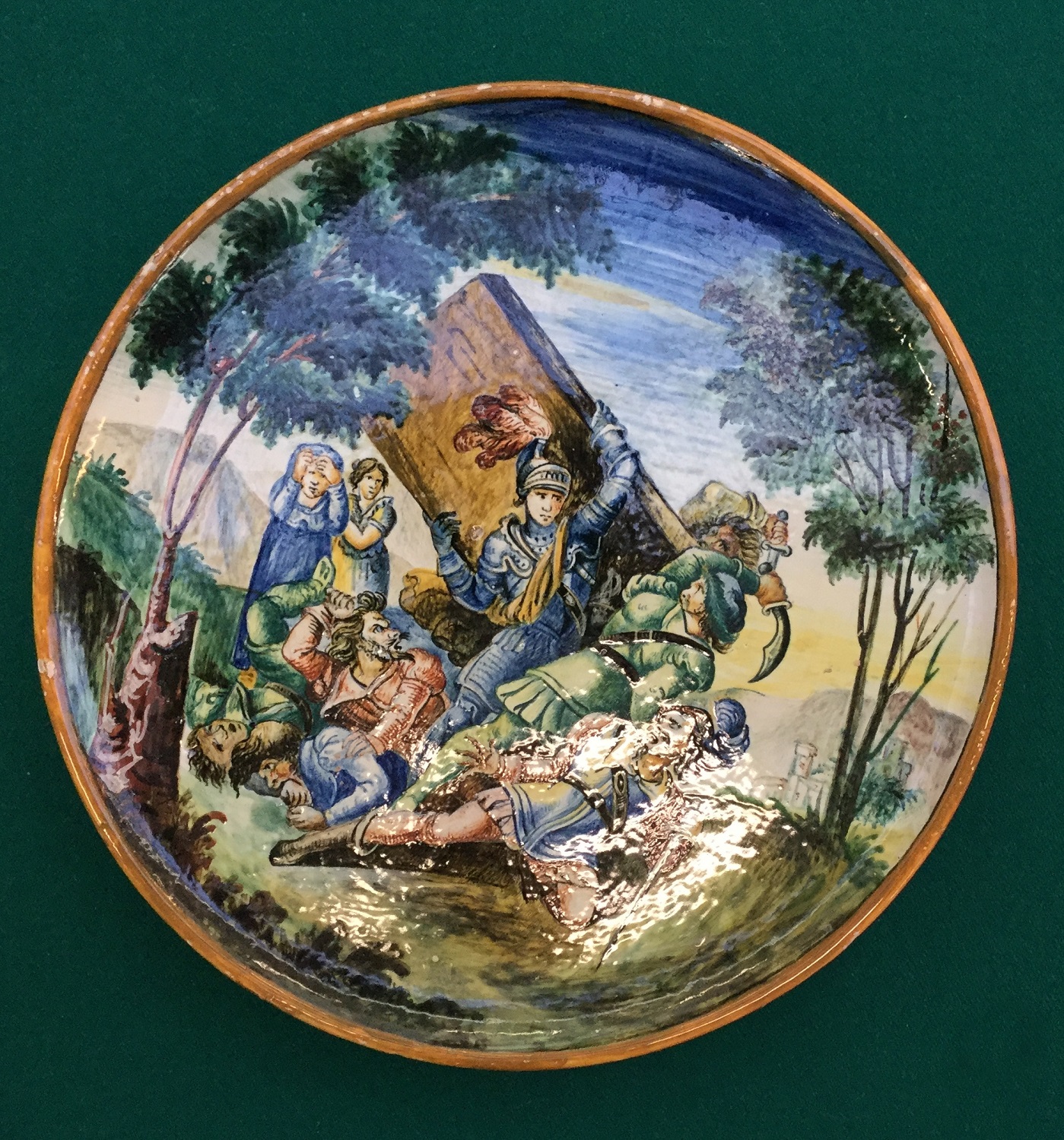 Manifattura del secolo XIX. Alzata in maiolica policroma decorata a scena storica (d. cm 31) (restauri)