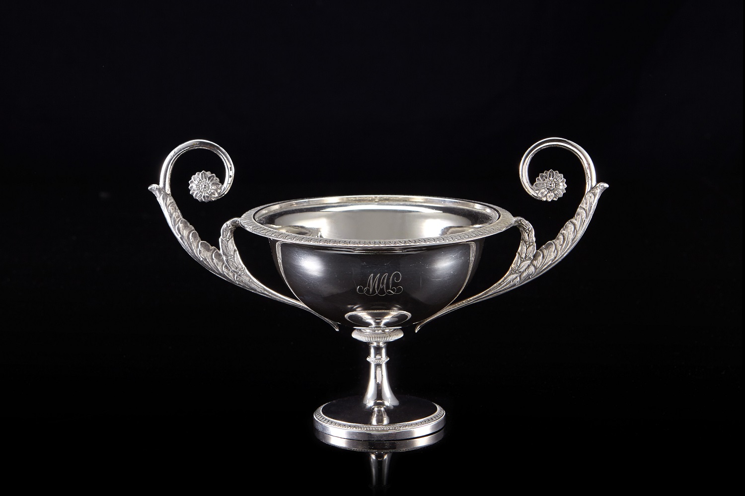 Zuccheriera biansata in argento cesellata con profili a palmette, anse a foglia di acanto e fiore. Milano, 1812 - 1832. Argentieri Cairati e Schiomachen (h. cm 14) (g 400 ca.)