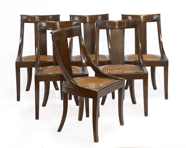 Gruppo di sei sedie a gondola in noce con gambe anteriori a sciabola Secolo XIX