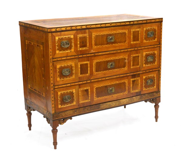 Comò a tre cassetti lastronato in noce, filettato e intarsiato a motivi geometrici, gambe tornite. Inizio secolo XIX (cm 120x105x58) (difetti e restauri)
