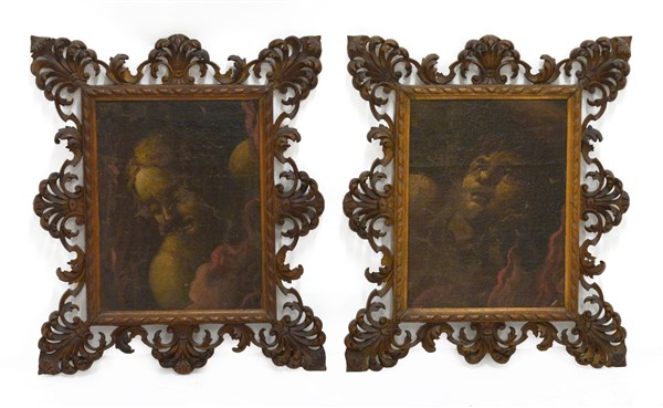 Ignoto "Volti" coppia di frammenti ad olio su tela (cm 32x24) In cornici del secolo XIX in legno intagliato e traforato (difetti e mancanze)