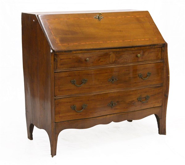Ribalta in noce filettata, anta celante due cassetti, sportello e vani, tre cassetti di forma mossa, piedi e fascia sagomati, sec. XVIII (cm 112x105x53) (difetti e restauri)
