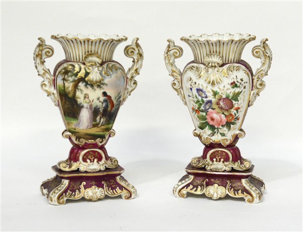 Manifattura francese, secolo XIX. Coppia di vasi biansati in porcellana decorat