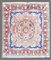 Annodato in lana e seta. Decoro con medaglione bianco su fondo camoscio. Angolari su vasi fioriti su fondo blu. Bordura a vasi con fondo mattone (cm 200x200) (difetti)