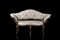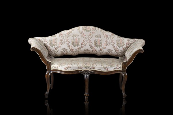 Piccolo divano ad orecchioni in noce con braccioli e schienale mosso, gambe sagomate terminanti a riccioli. Secolo XVIII (largh. cm 167) (difetti e restauri)